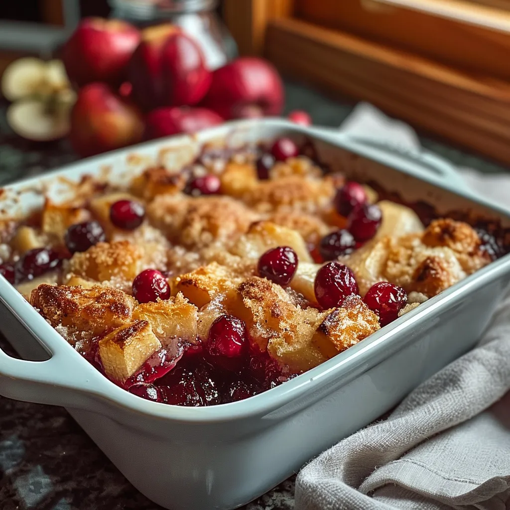 A warm, comforting dessert made with tender apples and tart cranberries, topped with a buttery crumble. Perfect for cozy nights or festive occasions.