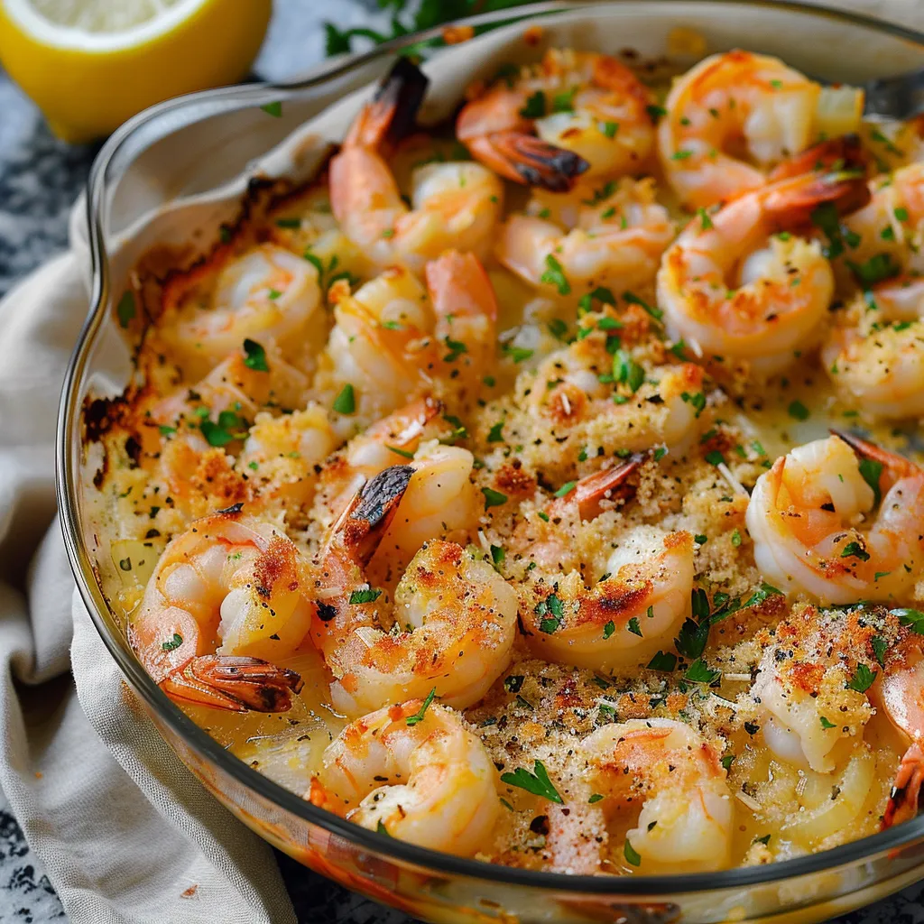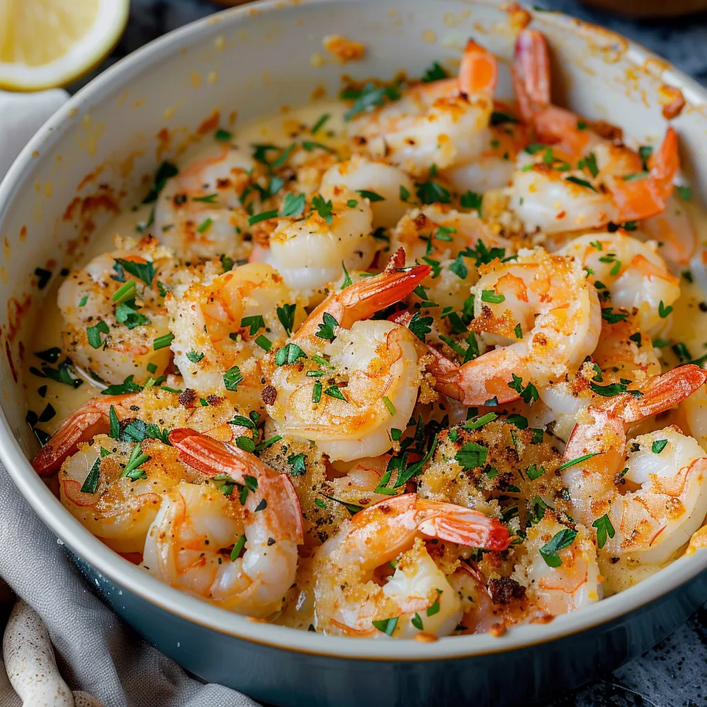 Indulge in savory baked shrimp scampi topped with crunchy bread crumbs A delightful dish that elevates your dinner experience Enjoy every bite