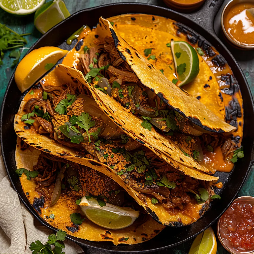 - Serve Your Birria Tacos: Warm the corn tortillas in a skillet, dip them in the broth, fill with shredded beef, and top with garnishes.