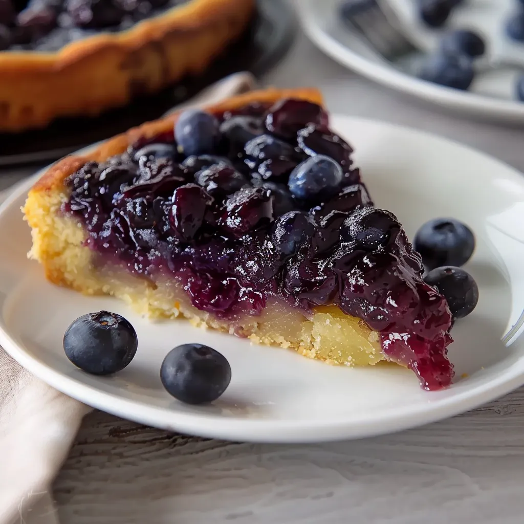 A nostalgic dessert featuring caramelized blueberries on top of a fluffy, buttery cake, perfect for gatherings or cozy nights.