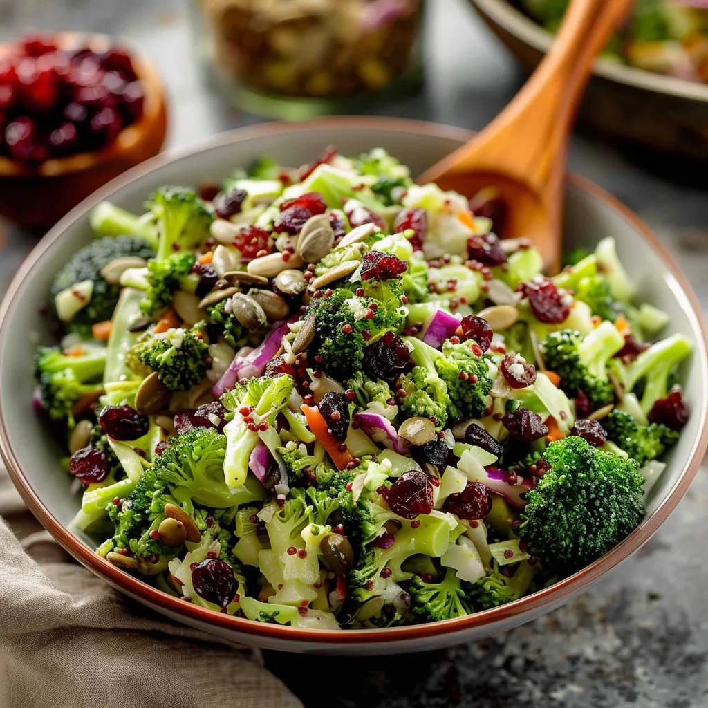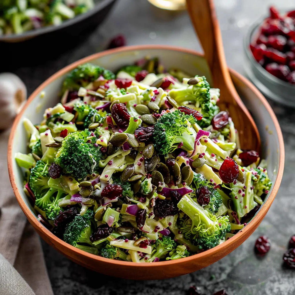 A refreshing and colorful side dish featuring shredded broccoli slaw, sweet dried cranberries, and crunchy sunflower seeds, all tossed in a creamy dressing.