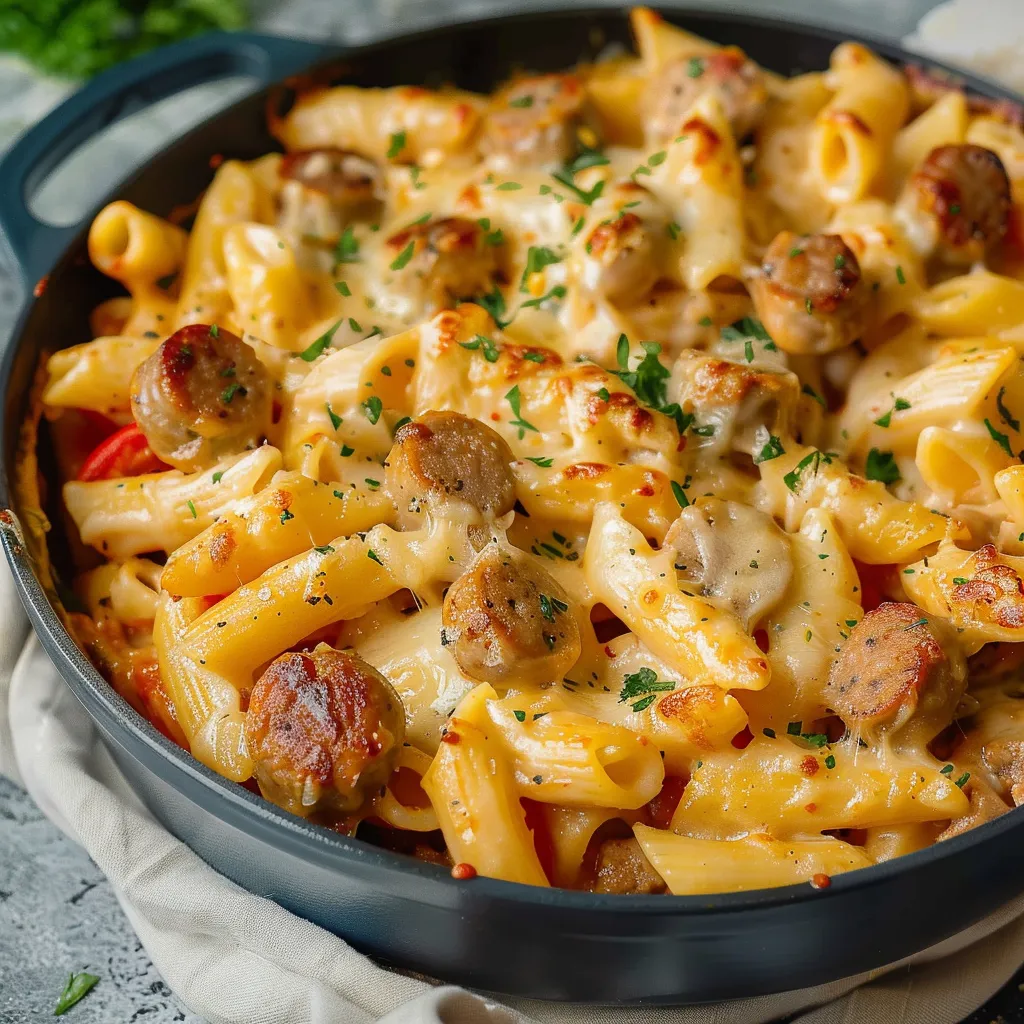 Keywords: Cheesy Sausage Pasta, Italian recipe, pasta recipes, hearty dinners