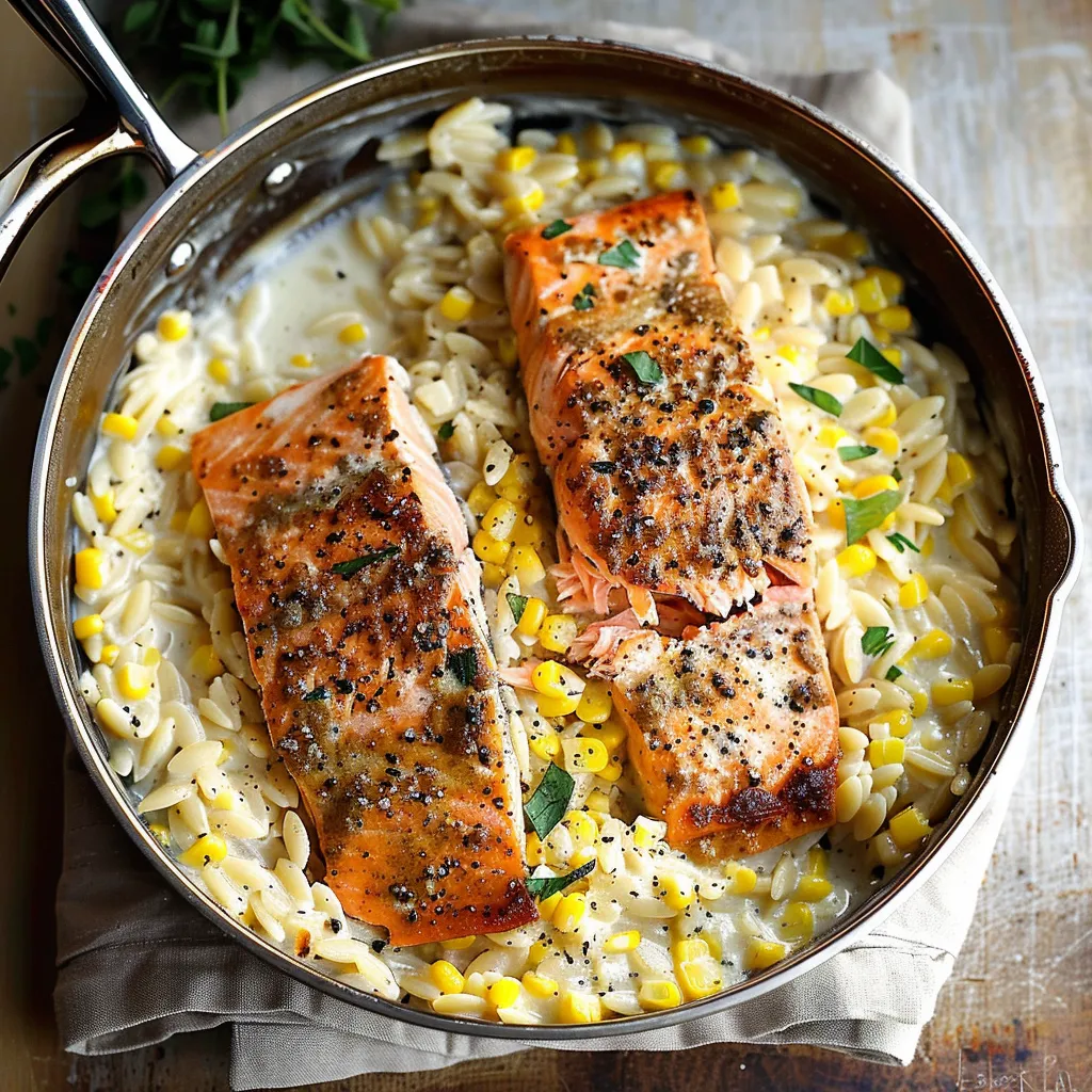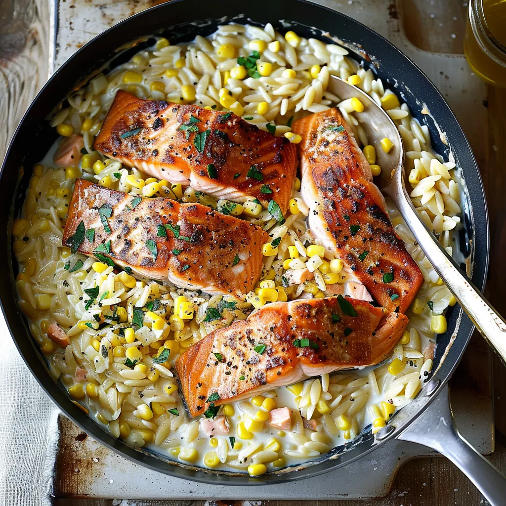 Savor the delightful flavors of Creamed Corn Orzo with Salmon a creamy comforting dish thats simple to make Perfect for weeknightstry it today