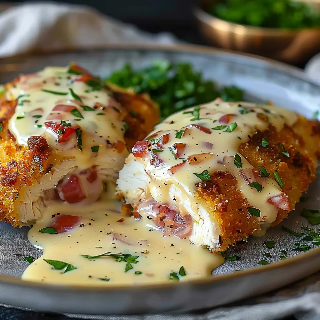 This dish is everything you’d want from a comfort meal. Imagine taking that first warm bite after a long day—it’s that blissful mix of savory and creamy, with layers of flavor from the smoked ham and melted cheese. The chicken is juicy, with a slight crunch from the breadcrumbs, and the rich, velvety sauce wraps around it all, creating a delightful symphony of tastes that dance on your palate. Each forkful is like a reminder of family gatherings and cozy nights spent laughing over good food. You’re gonna love it!