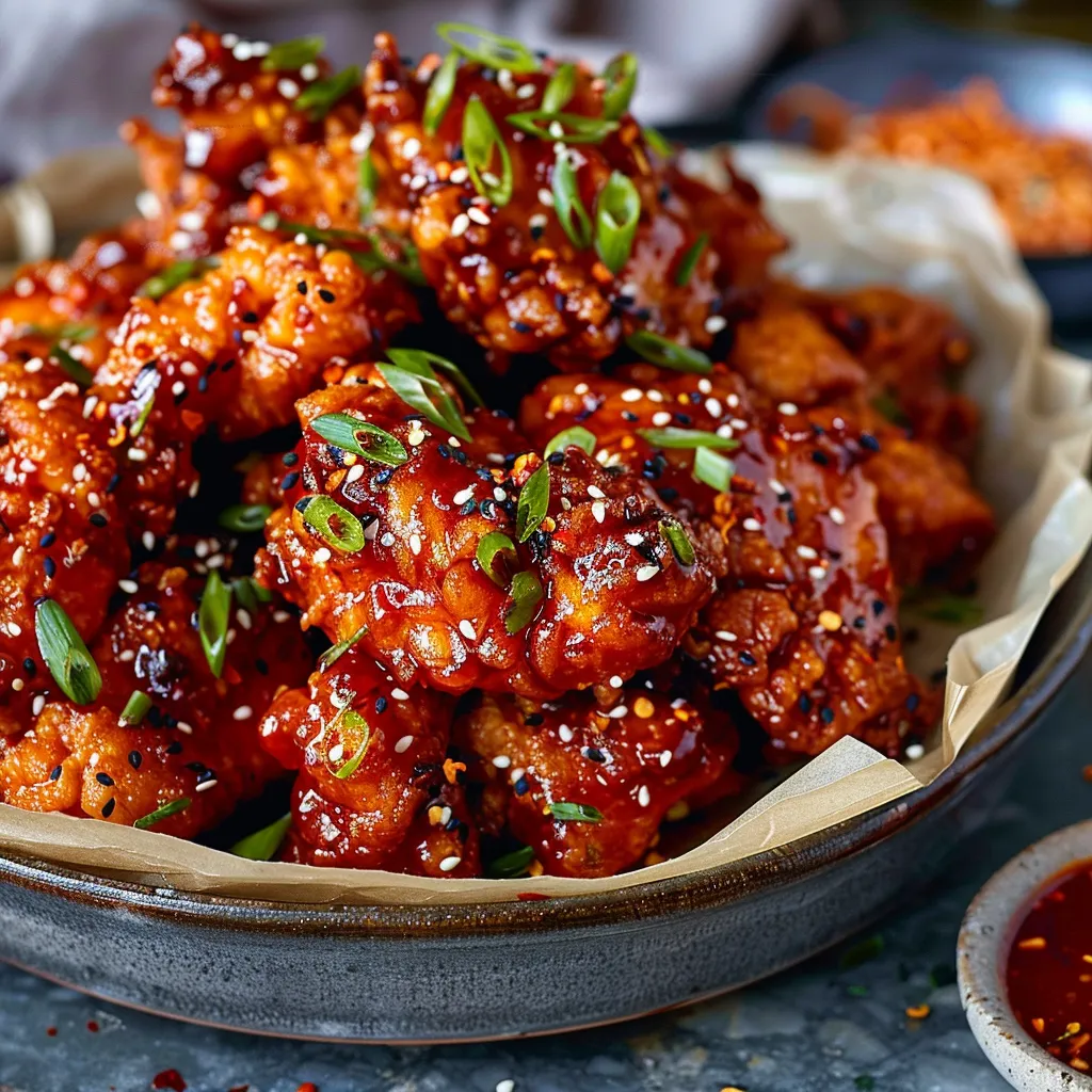 Imagine walking in from the cold—you’re greeted by a warm, savory aroma. The first bite of this Korean fried chicken is crisp yet tender, breaking apart to reveal juicy chicken that practically melts in your mouth. The exterior is a delightful combination of sweet, spicy, and slightly tangy, with a crunchy texture that keeps you coming back for more. Not to mention, the secret sauce—oh, that luscious, sticky glaze! It’s like that first cozy hug after a long day; it wraps around you with warmth and comfort, leaving you wanting another piece, and maybe another, too.