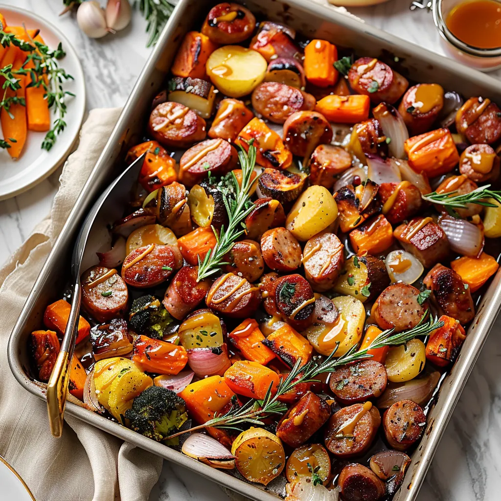 - Make the sauce: In a small bowl, whisk together the Dijon mustard and maple syrup until smooth. Pour this heavenly mix over the sausage and veggies, and toss to coat beautifully.