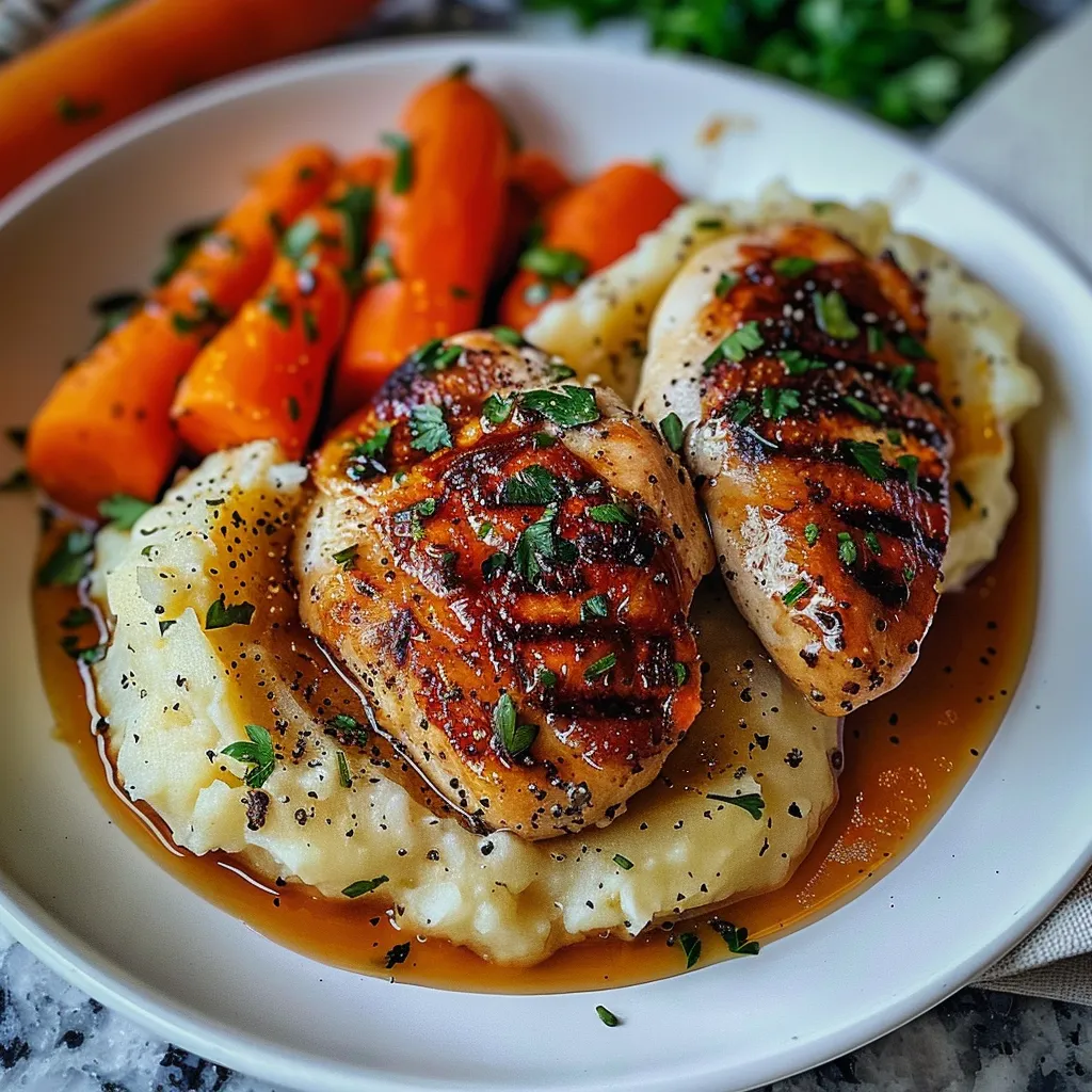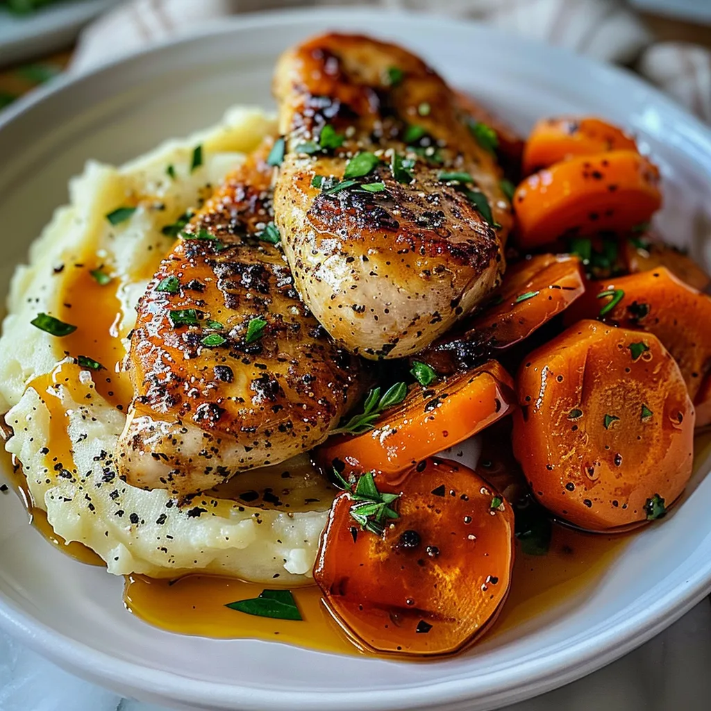 Savory Garlic Herb Chicken with Creamy Mashed Potatoes Glazed Carrots