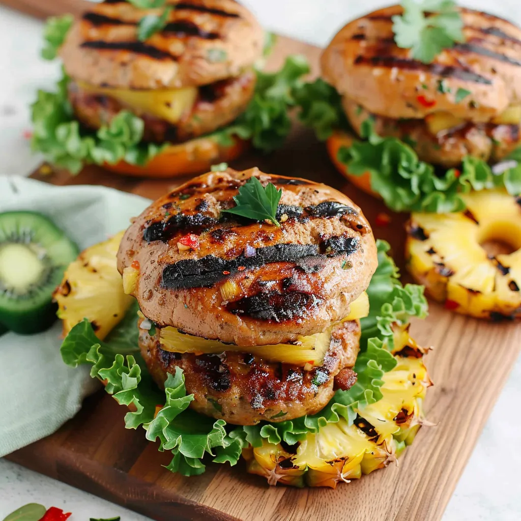 Juicy grilled turkey burgers paired with sweet grilled pineapple, perfect for summer gatherings and weeknight dinners.