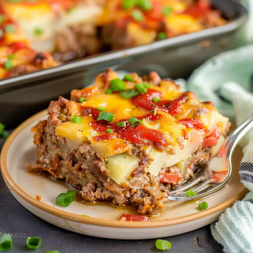 Imagine slicing into a beautifully cooked meatloaf, revealing layers of creamy potato goodness and savory meat seasoned to perfection. Each bite is a delightful balance of tender meat mixed with melty cheese and a hint of garlic. The texture is just right—moist yet firm, with that familiar comfort of home-cooked meals. It’s like that first warm bite after a long day—it soothes your spirit and transports you to a place of cozy, comforting vibes. The flavors meld together beautifully, reminding you of family gatherings and hearty dinners, and each mouthful feels like a little bit of love wrapped up in a meaty hug.