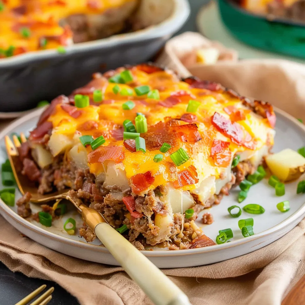 A comforting Loaded Potato Meatloaf with hearty flavors, combining ground beef, mashed potatoes, and melted cheese, perfect for cozy evenings and gatherings.