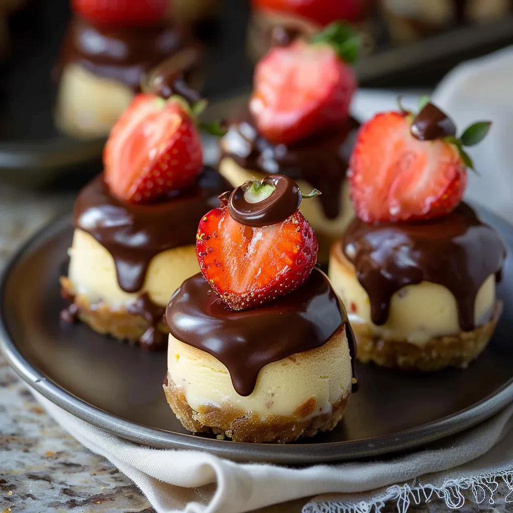 Delicious mini cheesecakes topped with chocolate covered strawberries, perfect for any occasion. A delightful treat that combines rich cheesecake, fruity strawberries, and decadent chocolate.