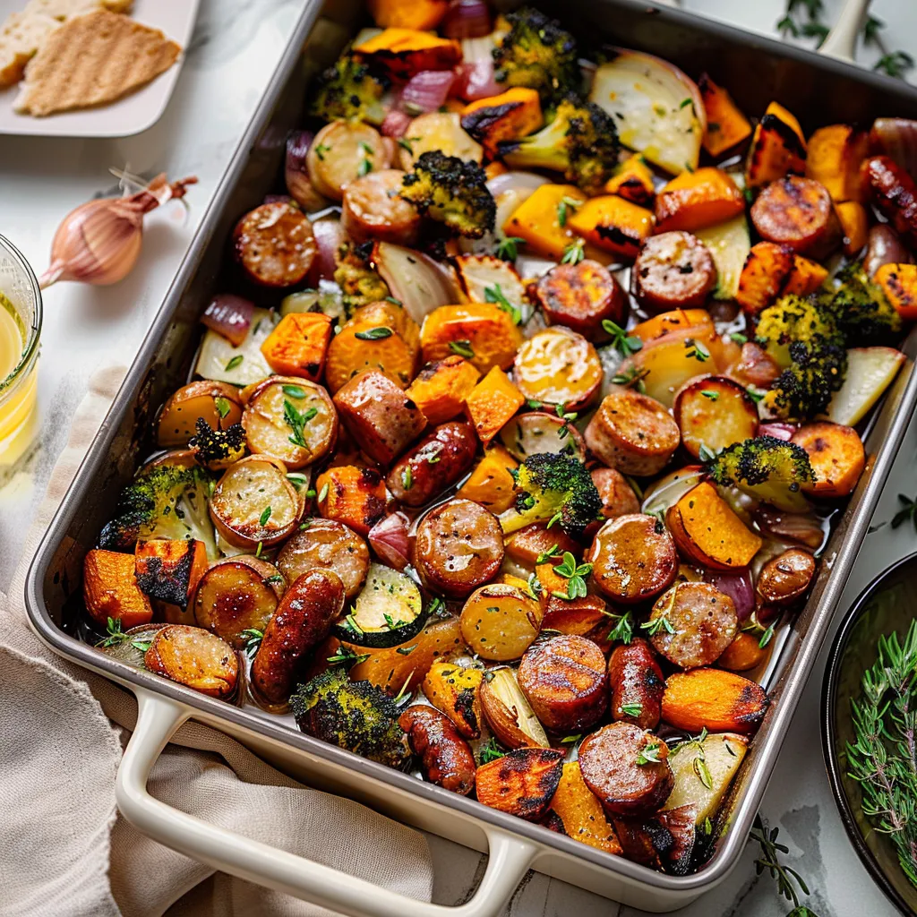 A comforting and versatile meal that combines juicy sausage, vibrant seasonal veggies, and a sweet-spicy Maple Dijon sauce, all cooked on one sheet pan.