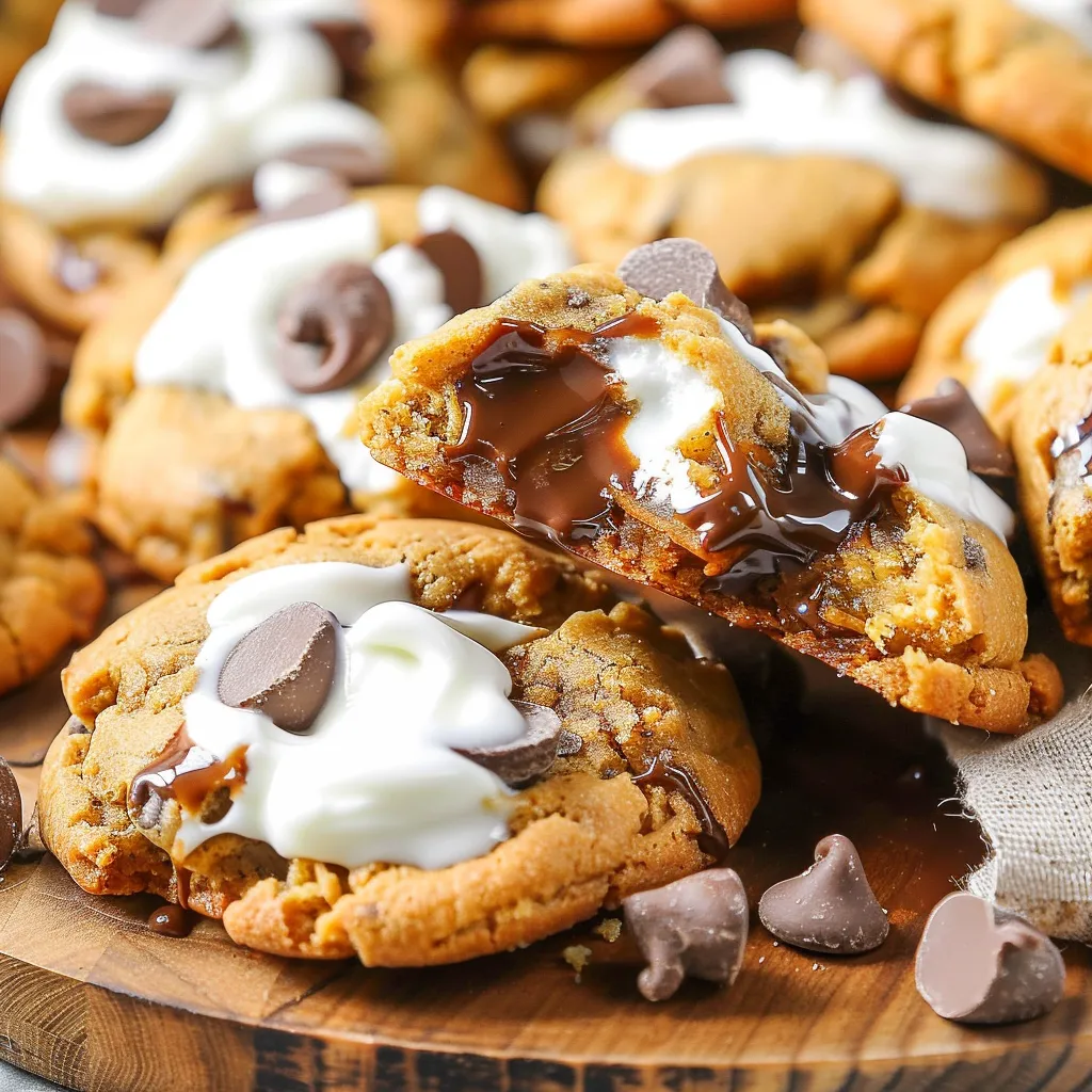 To serve, stack these cookies on a pretty plate and don’t be shy with the extra garnishes! Drizzling with chocolate or sprinkling some graham cracker crumbs can add a lovely touch. For leftovers—or if you can’t eat them all in one sitting—store these cookies in an airtight container at room temperature. They’ll stay soft for about a week! If you want to freeze them, just ensure they’re packed tightly so they don’t dry out. You can let them sit at room temperature for a bit before enjoying or pop them in the microwave for a few seconds to get that gooey center back.