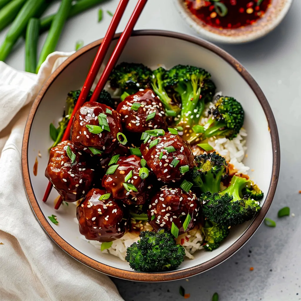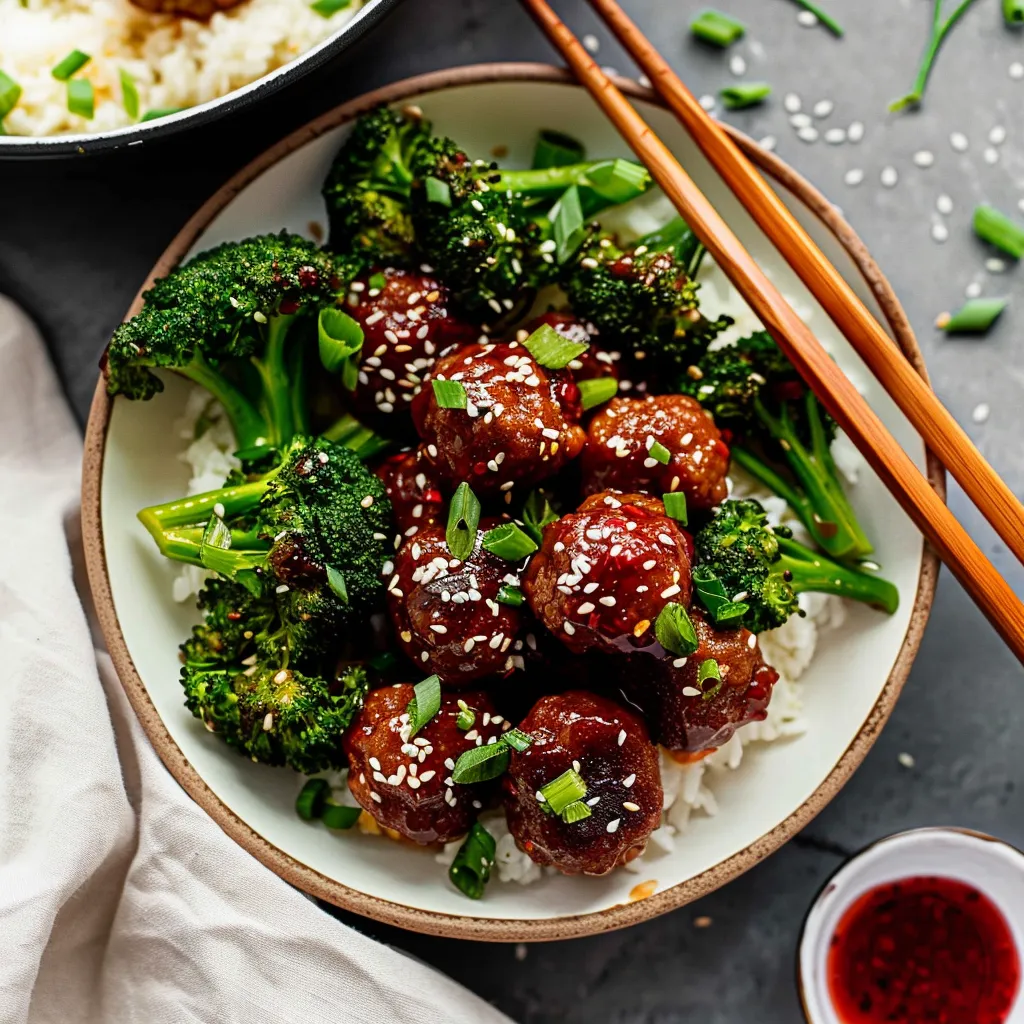 Sweet and Savory Sticky Mongolian Meatballs with Broccoli
