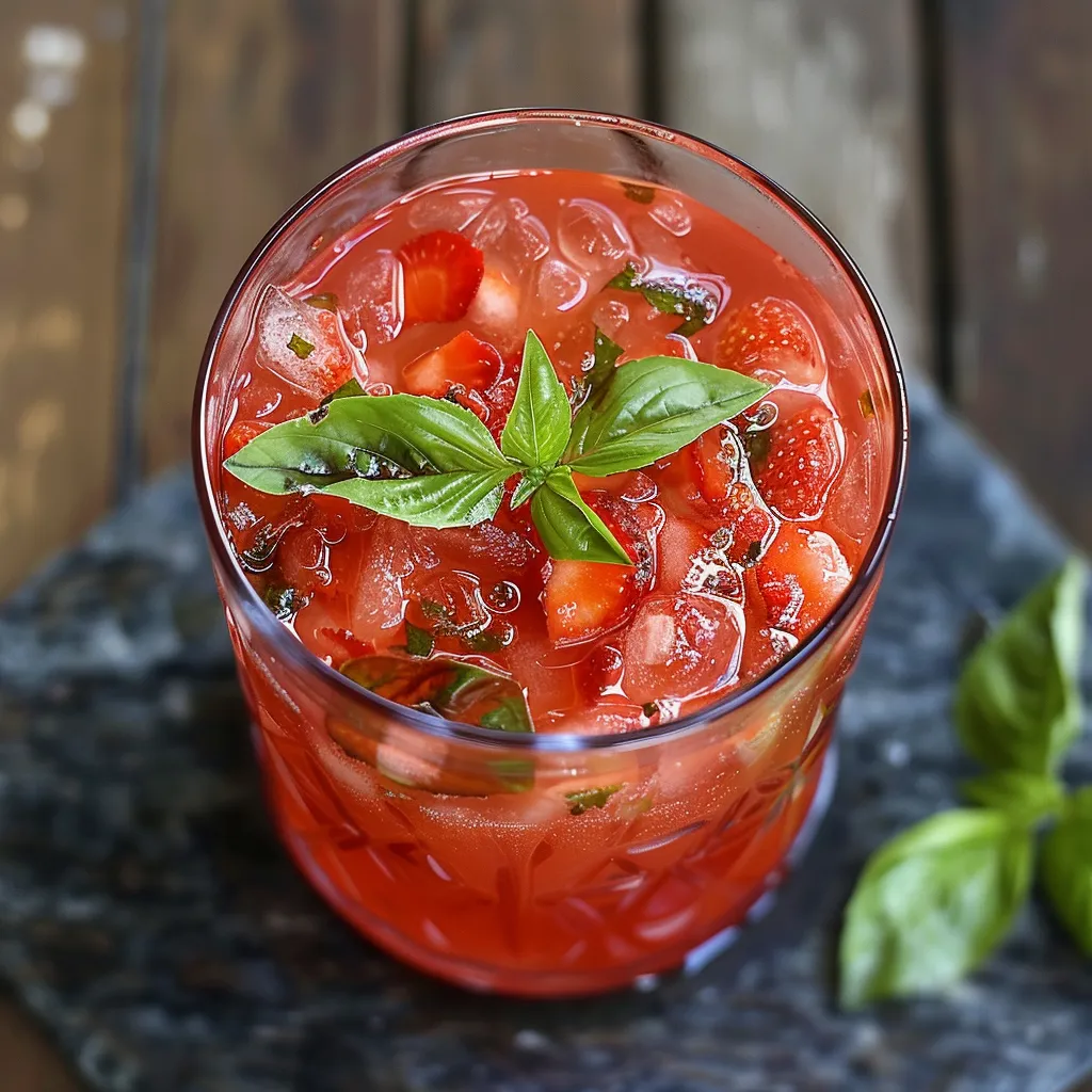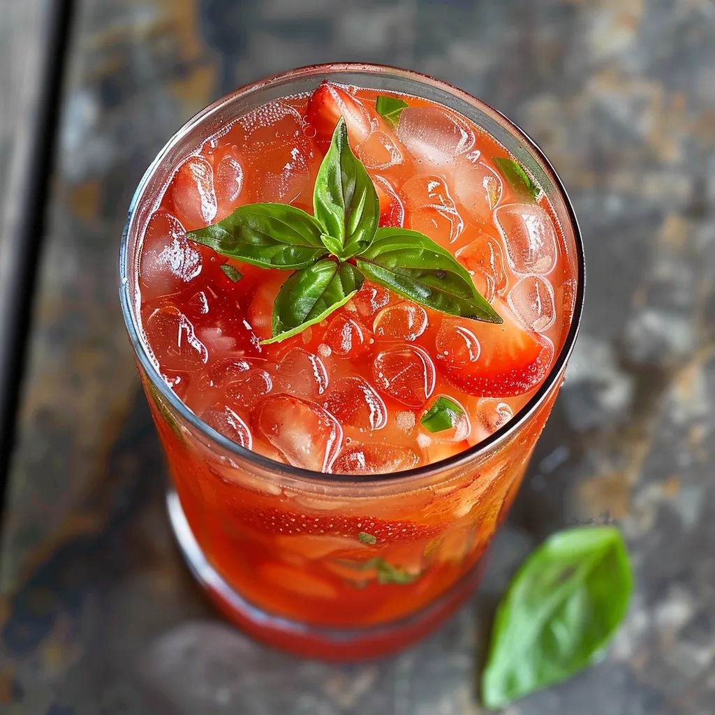 A refreshing and flavorful iced tea combining sweet strawberries and aromatic basil, perfect for summer gatherings.