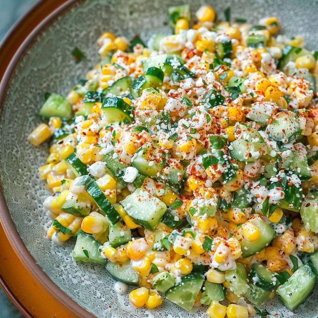 Oh, the flavor of this salad! Imagine biting into a juicy ear of corn right off the grill — sweet, smoky, and warm. Now, pair that with the cool, crisp crunch of fresh cucumbers and a citrusy, tangy dressing that brings it all together. It’s refreshing, creamy, and just a little spicy, which keeps every bite interesting. Each mouthful is like a burst of summer, a delightful harmony of sweet and savory. The creamy topping is reminiscent of being at a lively street fair, where vibrant flavors dance together under the sun. Seriously, your taste buds will thank you!