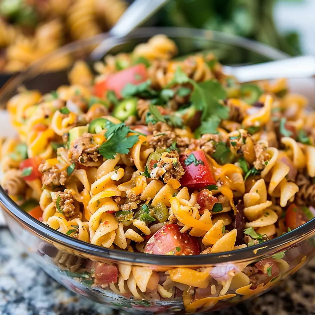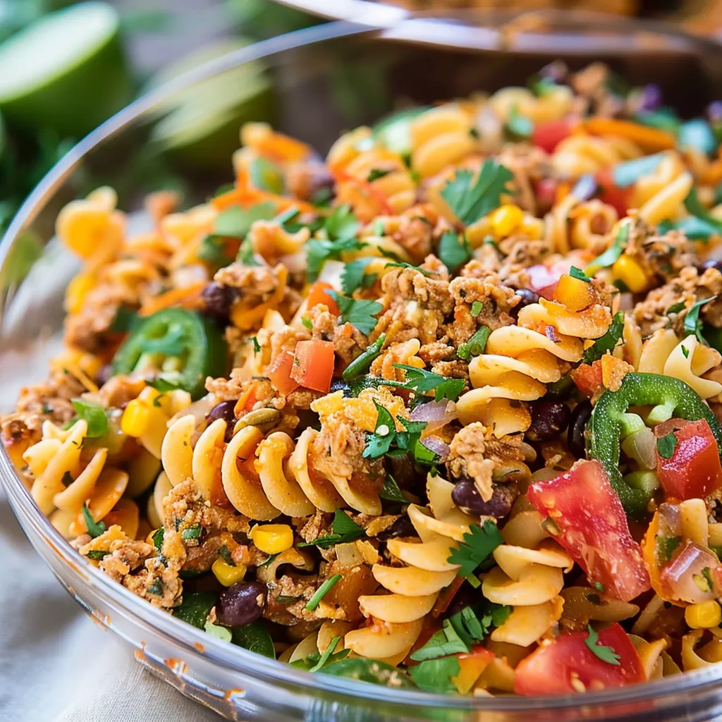A vibrant Taco Pasta Salad that combines the comforting texture of pasta with the zesty flavors of tacos, perfect for any gathering.