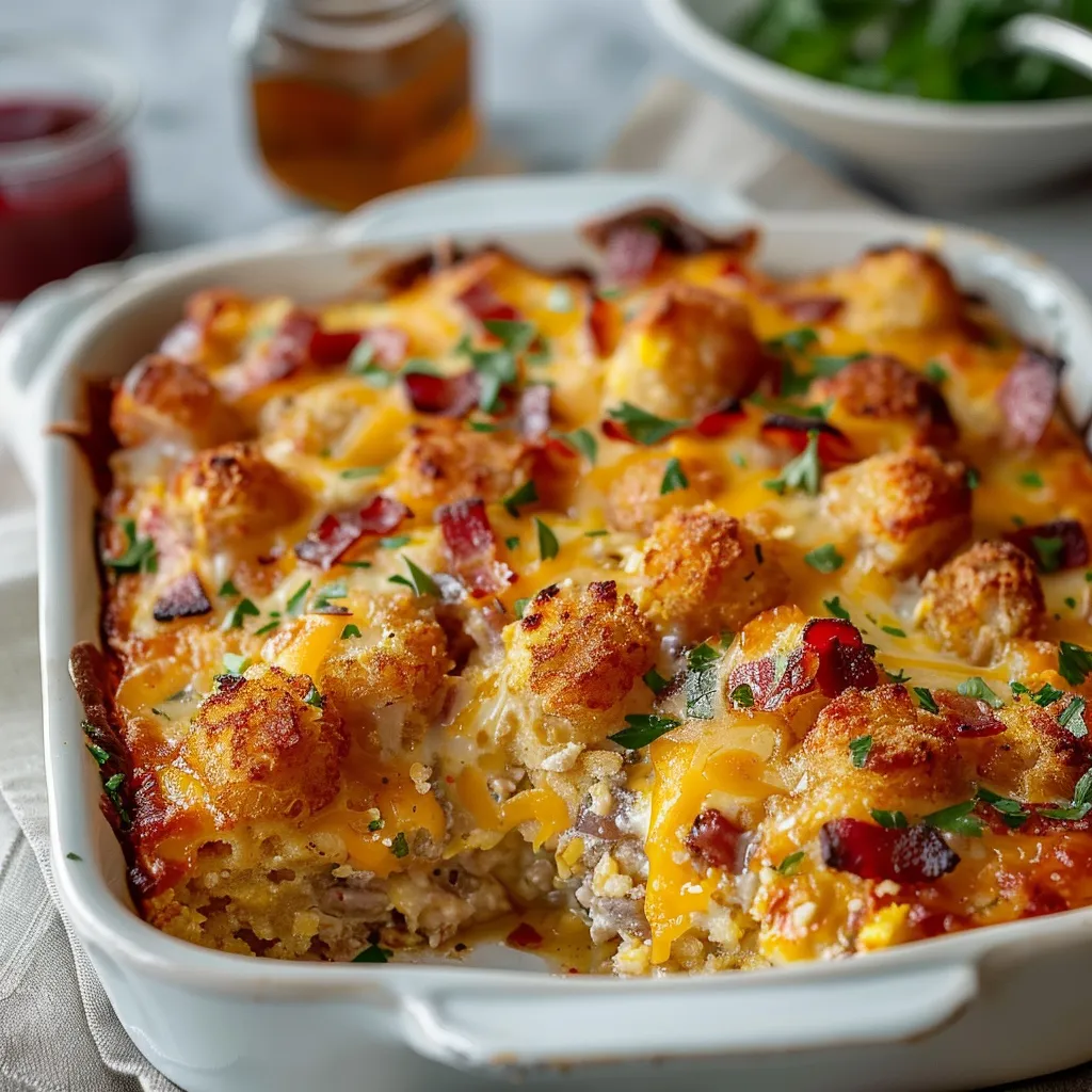 Start your day with this Tater Tot Breakfast Casserole featuring crispy tots and savory eggs Perfect for cozy mornings Try it today